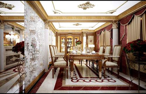Khu vực phòng ăn cũng không ngoại lệ, mang đậm nét tinh tế kinh điển của lối thiết kế cổ điển. Bộ bàn ăn tám chỗ sang trọng với chiếc bàn làm từ gỗ cao cấp phủ sơn trắng, hoa văn trạm khắc ở cạnh và chân bàn. Bộ ghế bọc đệm nhung với hoa văn độc đáo làm tăng sự quý phái, sang trọng.